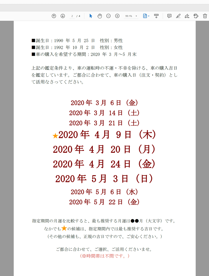 最大で、3人までです。例えば、夫・妻・息子で、合計3人なら鑑定可能です。指定人数が4人以上になると、合致する吉日の存在する可能性が限りなくゼロに近づいていくため、提供できないのです。